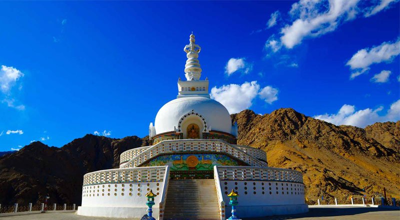 Shanti Stupa is a Buddhist white-domed stupa on a hilltop in Chanspa, Leh district, Ladakh, in the north India. It was built in 1991 by Japanese Buddhist Bhikshu, Gyomyo Nakamura and part of the Peace Pagoda mission. The Shanti Stupa holds the relics of the Buddha at its base, enshrined by the 14th Dalai Lama.